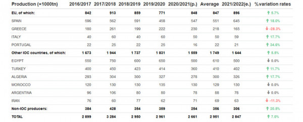 Μεταξύ των χωρών μελών της ΔΟΕ, η Ισπανία παρήγαγε το 20,5% των παγκόσμιων επιτραπέζιων ελιών, με όγκο 19,3% υψηλότερο από το προηγούμενο έτος. Η Αίγυπτος παρήγαγε το 18,8% του συνόλου, δηλαδή 23,1% λιγότερο από ό,τι παρήγαγε τη καλλιεργητική περίοδο 2019/20.