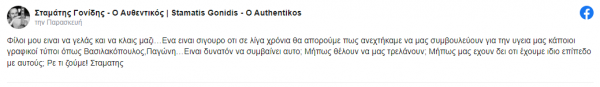 Ο λαϊκός τραγουδιστής έγραψε χαρακτηριστικά στη σελίδα του στο facebook: