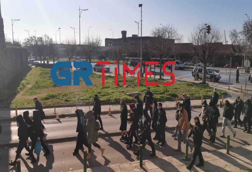 Συγκέντρωση ενόψει της μεταγωγής τους στα Δικαστήρια της Θεσσαλονίκης έχουν πραγματοποιήσει ομάδες αλληλέγγυων, που το απόγευμα της Κυριακής πραγματοποίησαν αιφνιδιαστικά κινητοποίηση μπροστά στο Αστυνομικό Μέγαρο της πόλης, όπου κρατούνται οι συλληφθέντες.