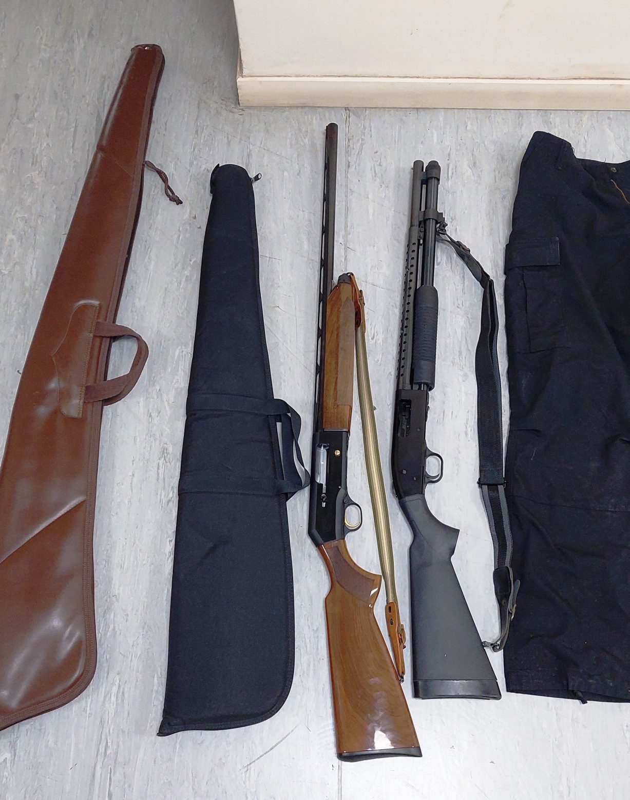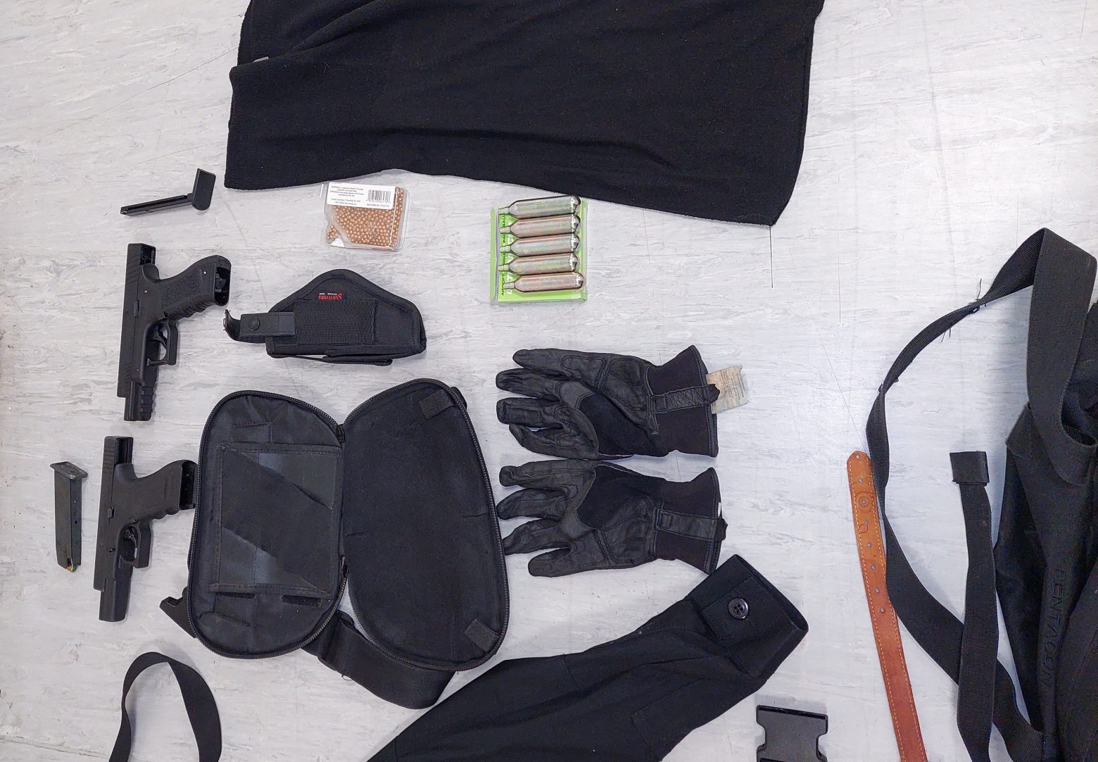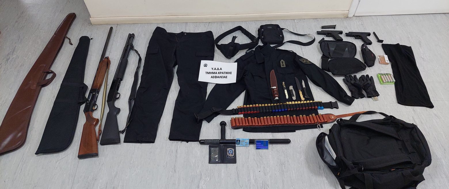 Σύμφωνα με την ΕΛΑΣ, κατά τη διάρκεια ελέγχου σε ΙΧ φορτηγό που επέβαιναν οι δύο συλληφθέντες, εντοπίστηκαν, μεταξύ άλλων, και κατασχέθηκαν: Δύο καραμπίνες, πιστόλι κρότου, 4 μαχαίρια, 5 φυσίγγια κυνηγετικού όπλου, 2 θήκες με 46 φυσίγγια κυνηγετικού όπλου, 2 πλαστικοποιημένες ταυτότητες με τη φωτογραφία του 36χρονου με στολή της Ελληνικής Αστυνομίας, χιτώνιο και παντελόνι αστυνομικής στολής, πορτοφόλι με μεταλλικό σήμα της ΕΛΑΣ και κουκούλα.