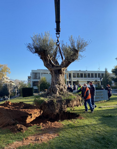 Μια εντυπωσιακή υπεραιωνόβια ελιά μεταφυτεύθηκε στο κήπο του δημαρχιακού μεγάρου στο Δήμο Παπάγου - Χολαργού. Από τις καταστροφές στα υπό κατάληψη σχολεία, στο συμβολισμό της γαλήνης και της ζωής.