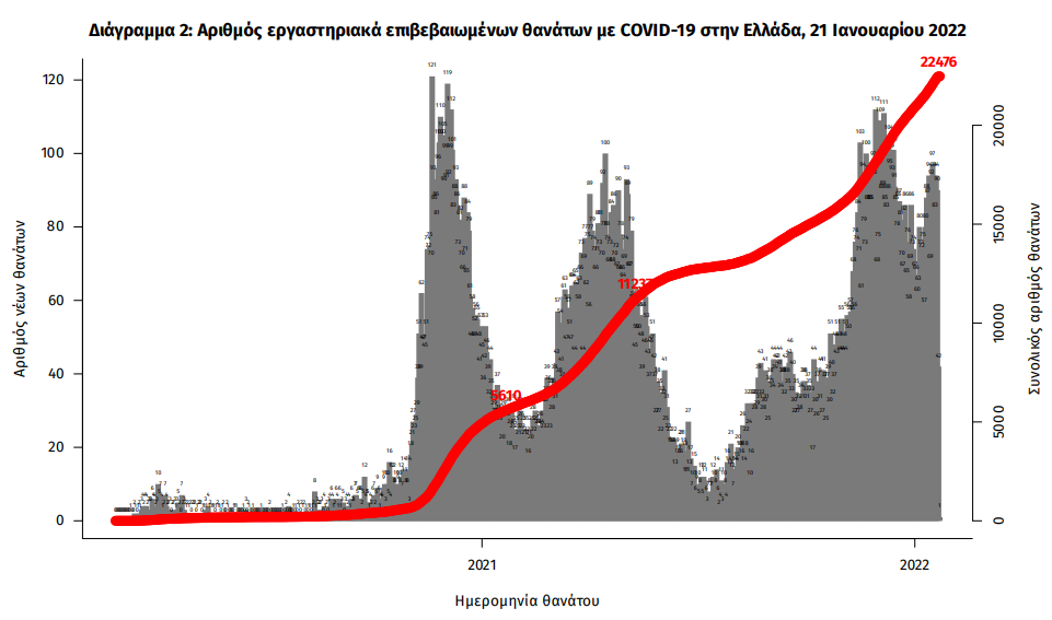 Οι νέοι θάνατοι ασθενών με COVID-19 είναι 108, ενώ από την έναρξη της επιδημίας έχουν καταγραφεί συνολικά 22.476 θάνατοι. Το 95.0% είχε υποκείμενο νόσημα ή/και ηλικία 70 ετών και άνω.