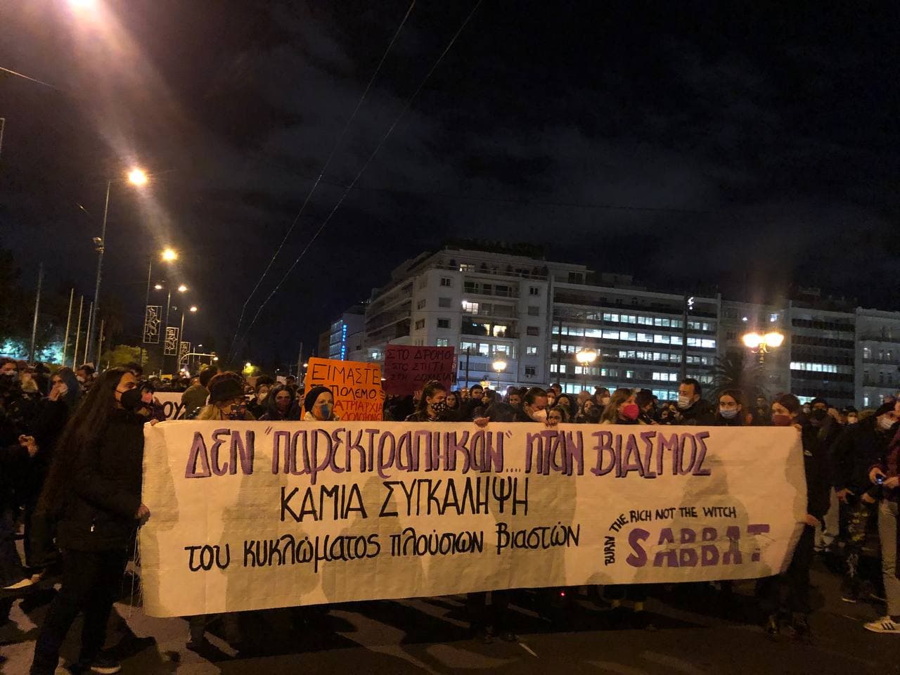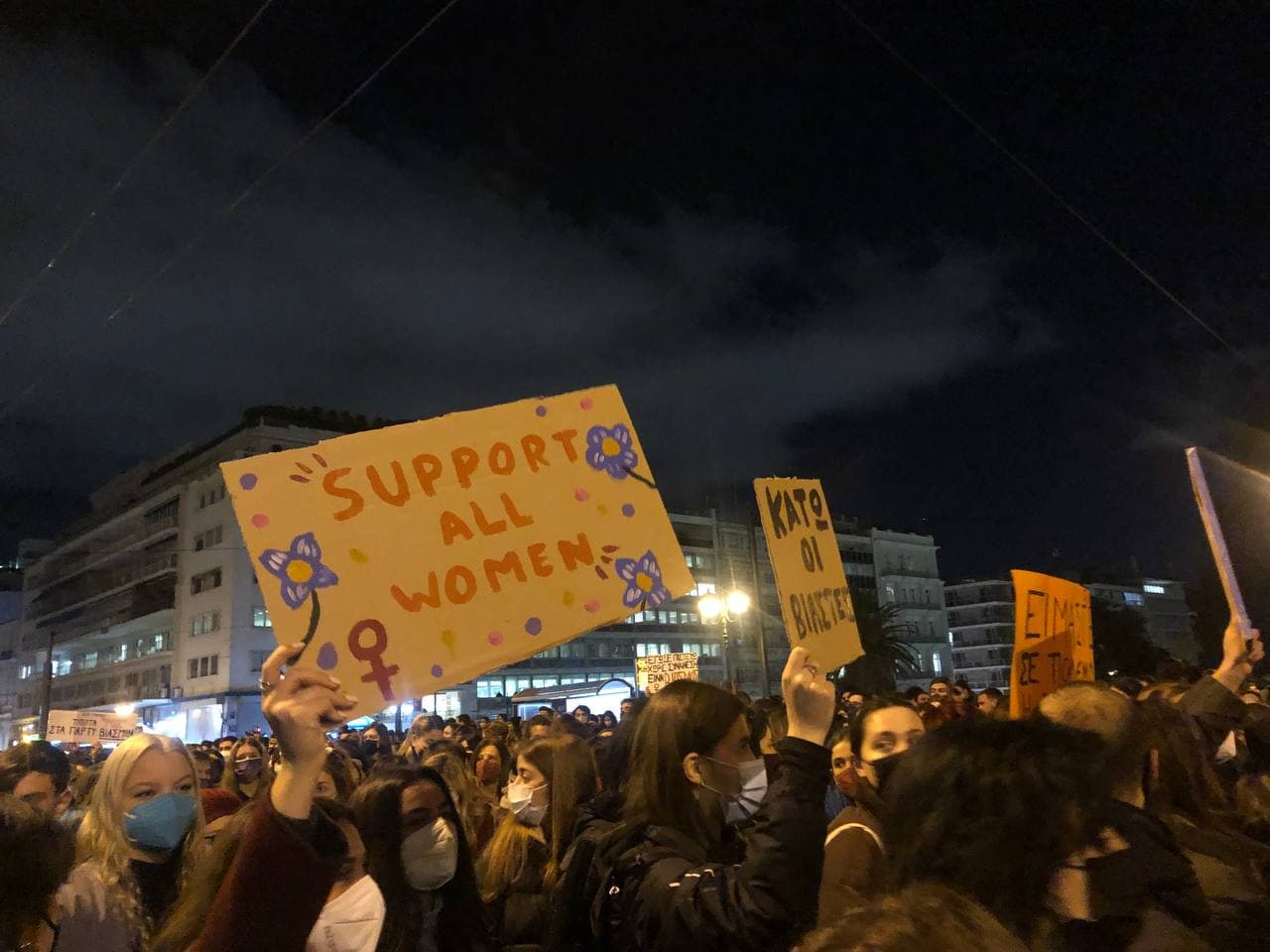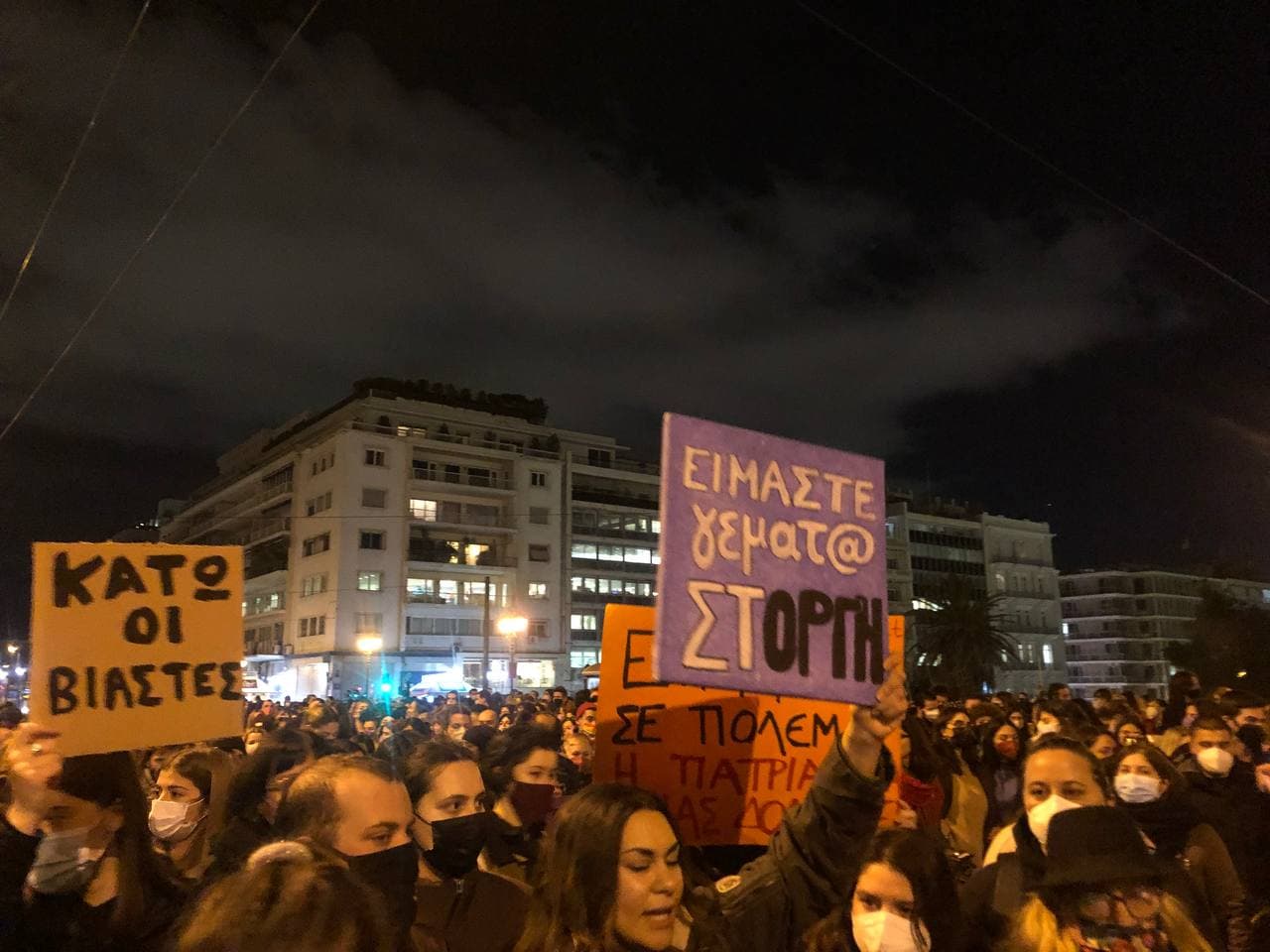 Συγκέντρωση και πορεία πραγματοποιεί πλήθος κόσμου στο Σύνταγμα μετά τις συγκλονιστικές αποκαλύψεις για τον ομαδικό βιασμό της 24χρονης Γεωργίας στη Θεσσαλονίκη.