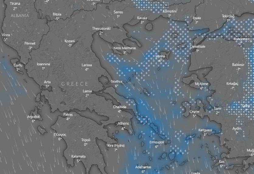 Τη Δευτέρα αναμένονται αρχικά χιονοπτώσεις ακόμα και σε πεδινά και παραθαλάσσια νησιωτικά τμήματα του Βορείου και Κεντρικού Αιγαίου, αλλά και τα νοτιότερα τμήματα της Χαλκιδικής. Οι χιονοπτώσεις αυτές γρήγορα θα επεκταθούν στα ανατολικά ηπειρωτικά τμήματα έως τις μεσημβρινές ώρες και αναμένεται να είναι τοπικά ισχυρές κυρίως στη Μαγνησία, στις Σποράδες, στην Ανατολική Στερεά, συμπεριλαμβανομένης και της Αττικής, στην Ανατολική Πελοπόννησο και στις Κυκλάδες.