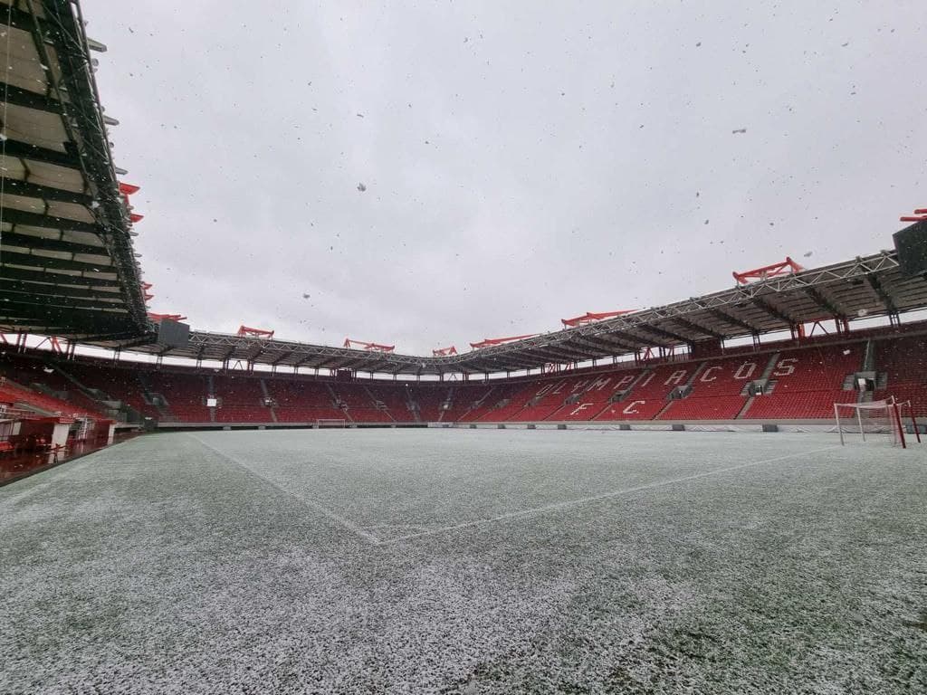 Συγκεκριμένα, το Καραϊσκάκη έχει εφοδιαστεί με χρώμα διαγραμμίσεως «αντιχιονιστικό» για να φαίνονται οι γραμμές του και να διεξαχθεί ο αγωνας της Τετάρτης με την ομάδα του Γιάννη Αναστασίου.