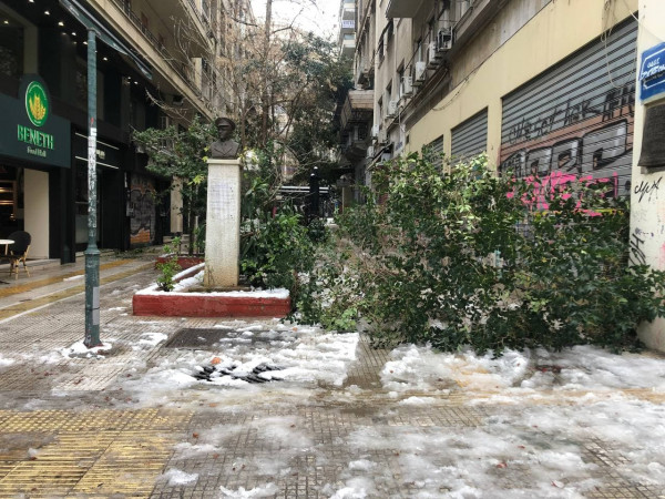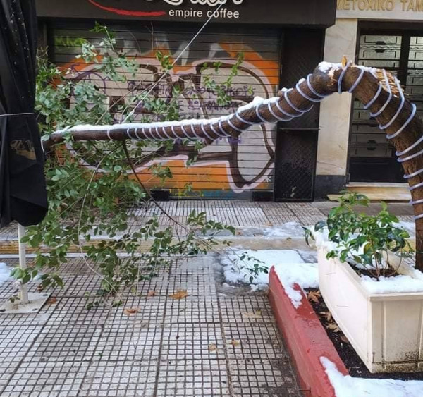 Καταστηματάρχης με επιχείρηση στο κέντρο της Αθήνας, κατάφερε μετά βίας να μεταβεί στο μαγαζί του επιχειρώντας μόνος του να απομακρύνει δέντρο που είχε μπλοκάρει στην είσοδο στο κατάστημα.