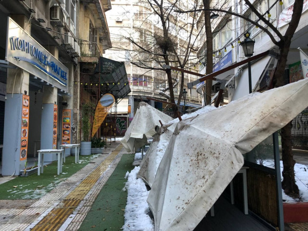 Σπασμένες ομπρέλες, πεσμένα δέντρα και κλαδιά πάνω στις εισόδους των καταστημάτων και παγωμένα πεζοδρόμια.