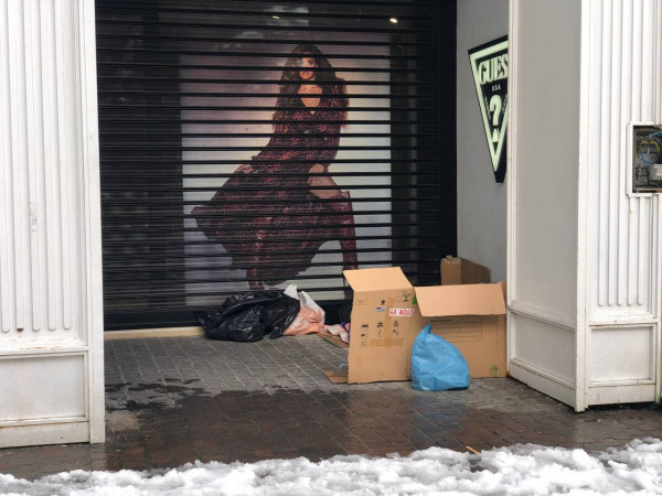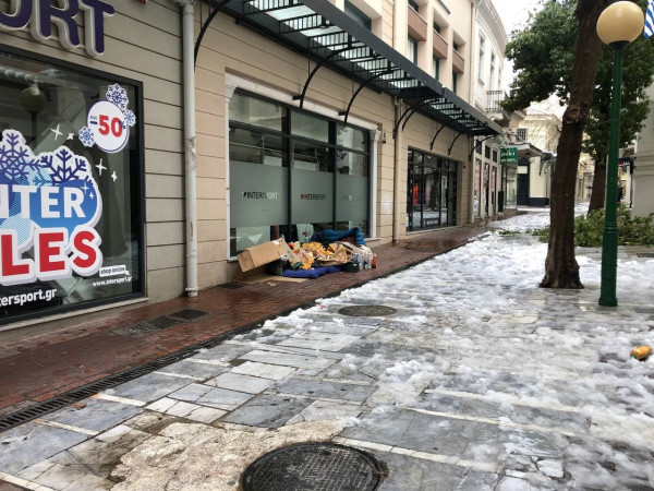 Έξω από τα κλειστά καταστήματα και κάτω από τα υπόστεγα της Ερμού, όπου «κόβει» ο αέρας και προφυλάσσονται από το χιόνι, αρκετοί άστεγοι συμπολίτες μας έχουν βρει καταφύγιο.