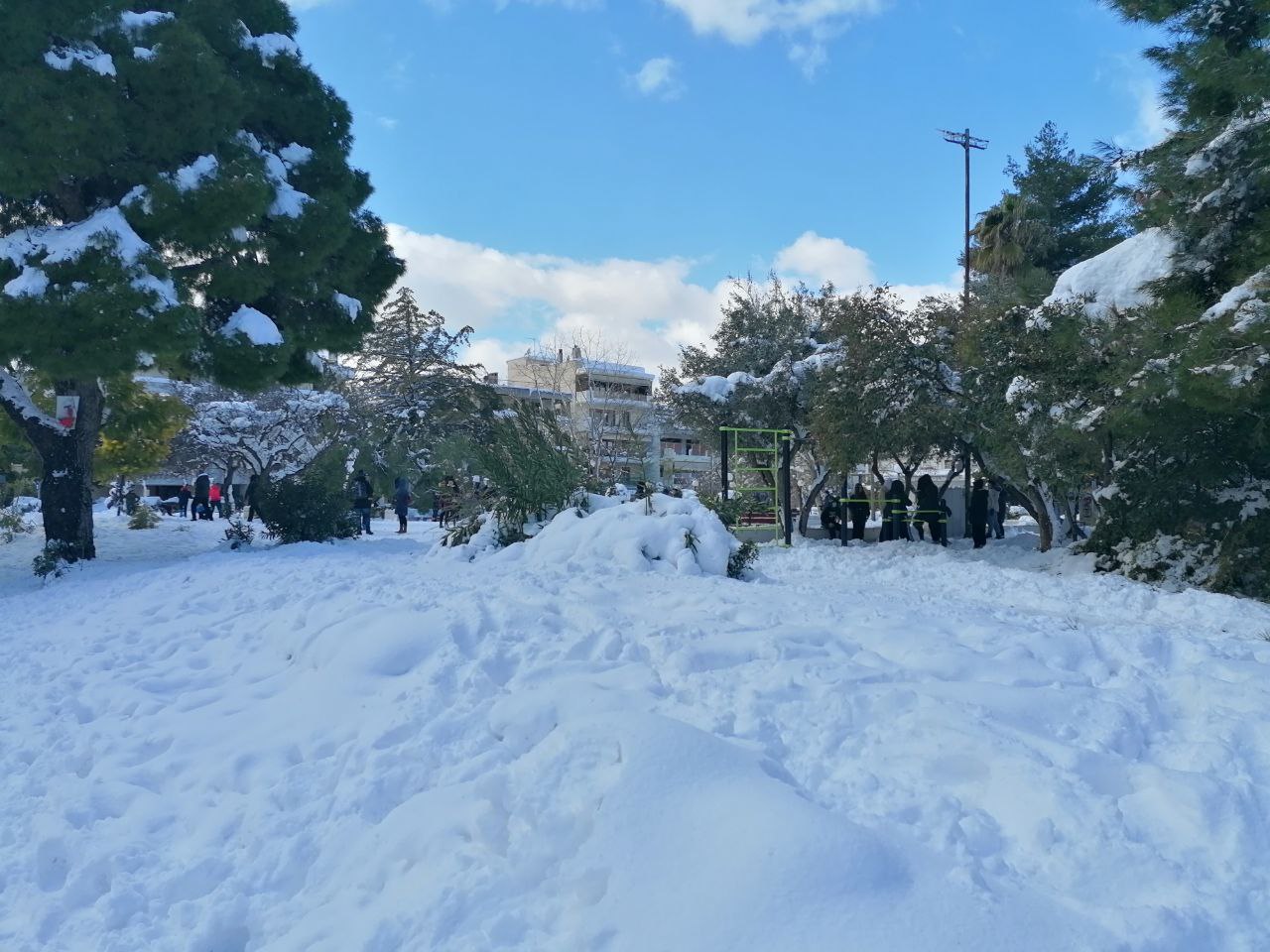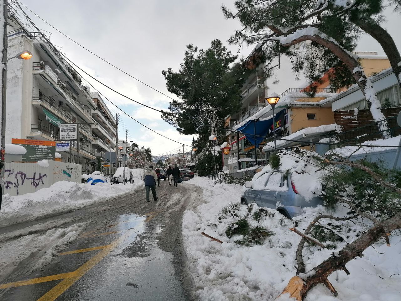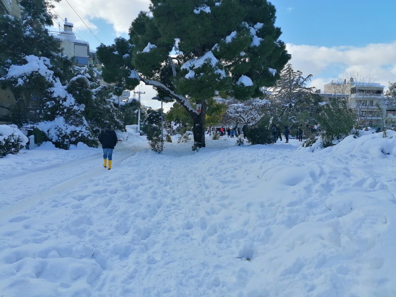 Το χιόνι παραμένει πυκνό, ιδιαίτερα στις περιοχές των βορείων προαστίων. Η εικόνα στο Κοντόπευκο της Αγίας Παρασκευής: