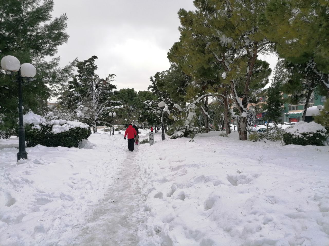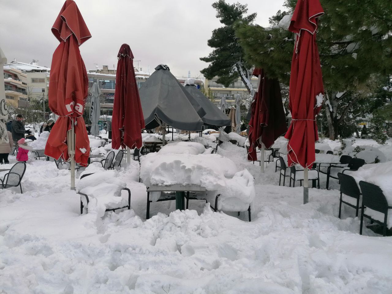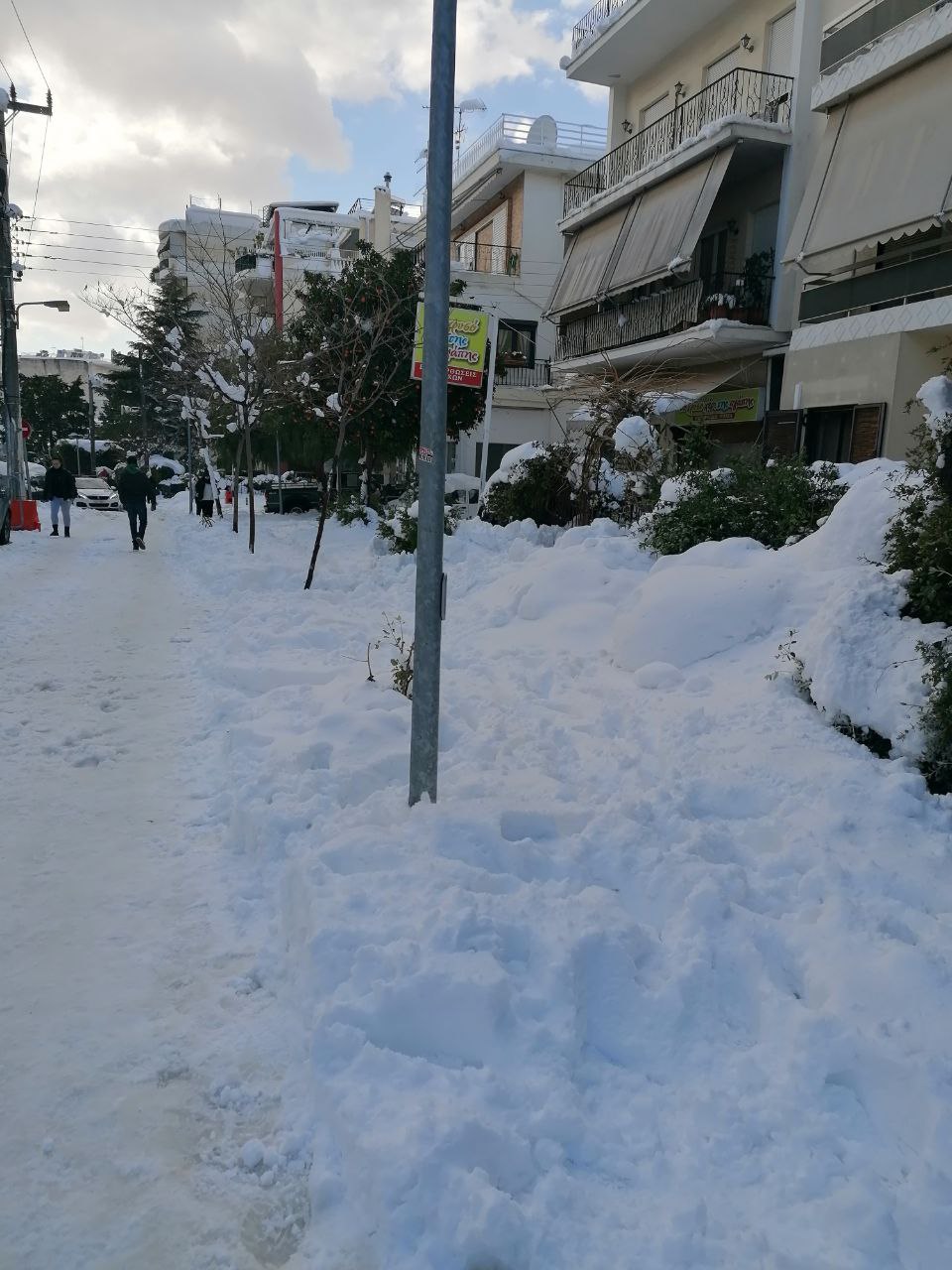 Το χιόνι παραμένει πυκνό, ιδιαίτερα στις περιοχές των βορείων προαστίων. Η εικόνα στο Κοντόπευκο της Αγίας Παρασκευής: