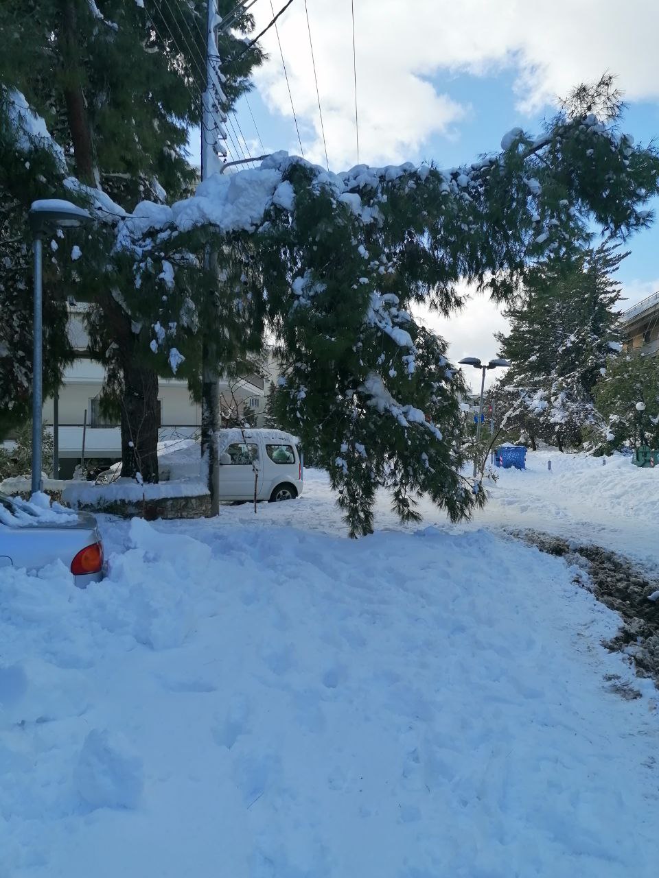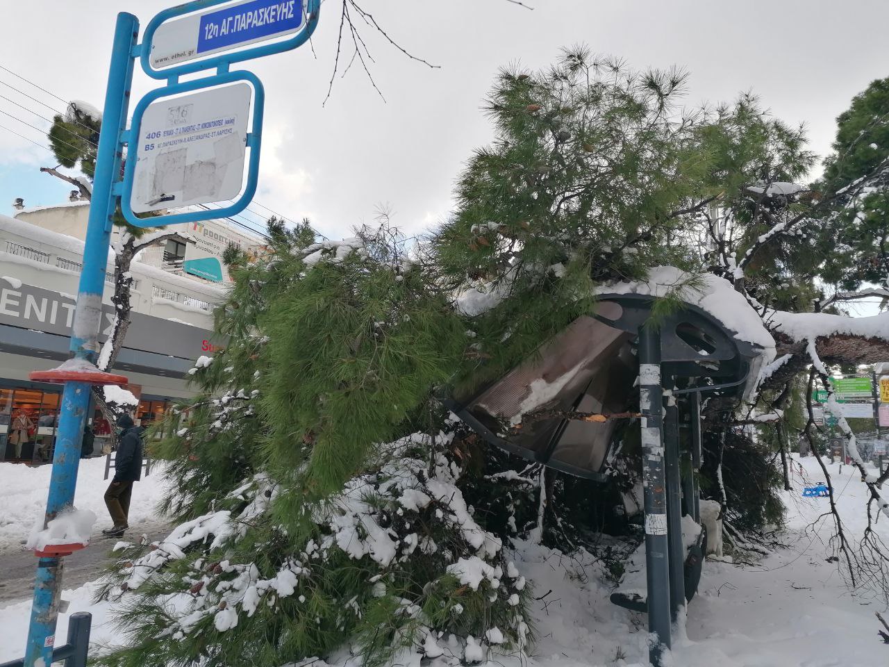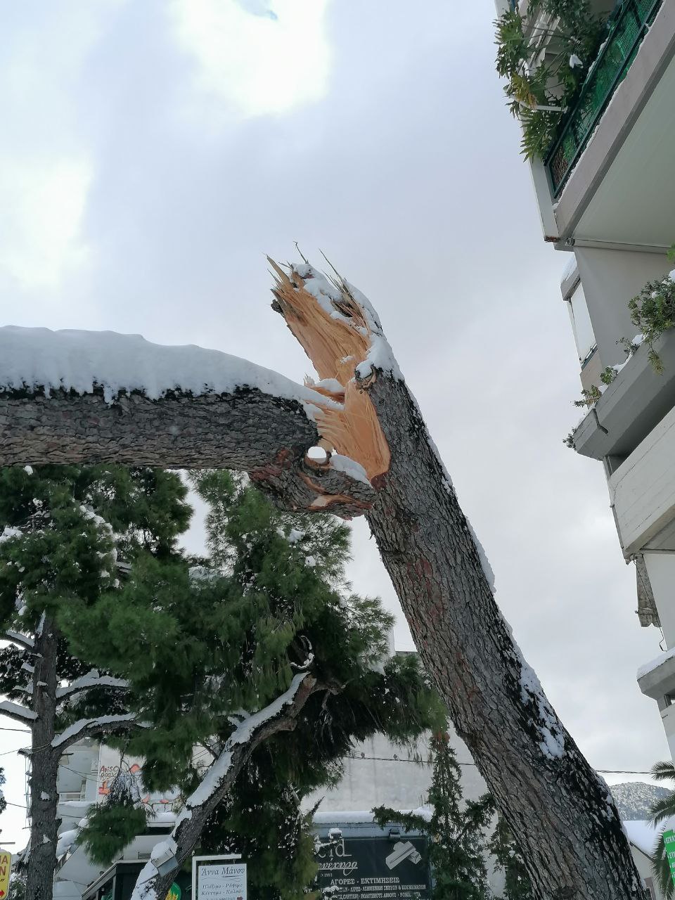 Δέντρα έχουν λυγίσει από το χιόνι στην Αγία Παρασκευή, στην πλατεία.