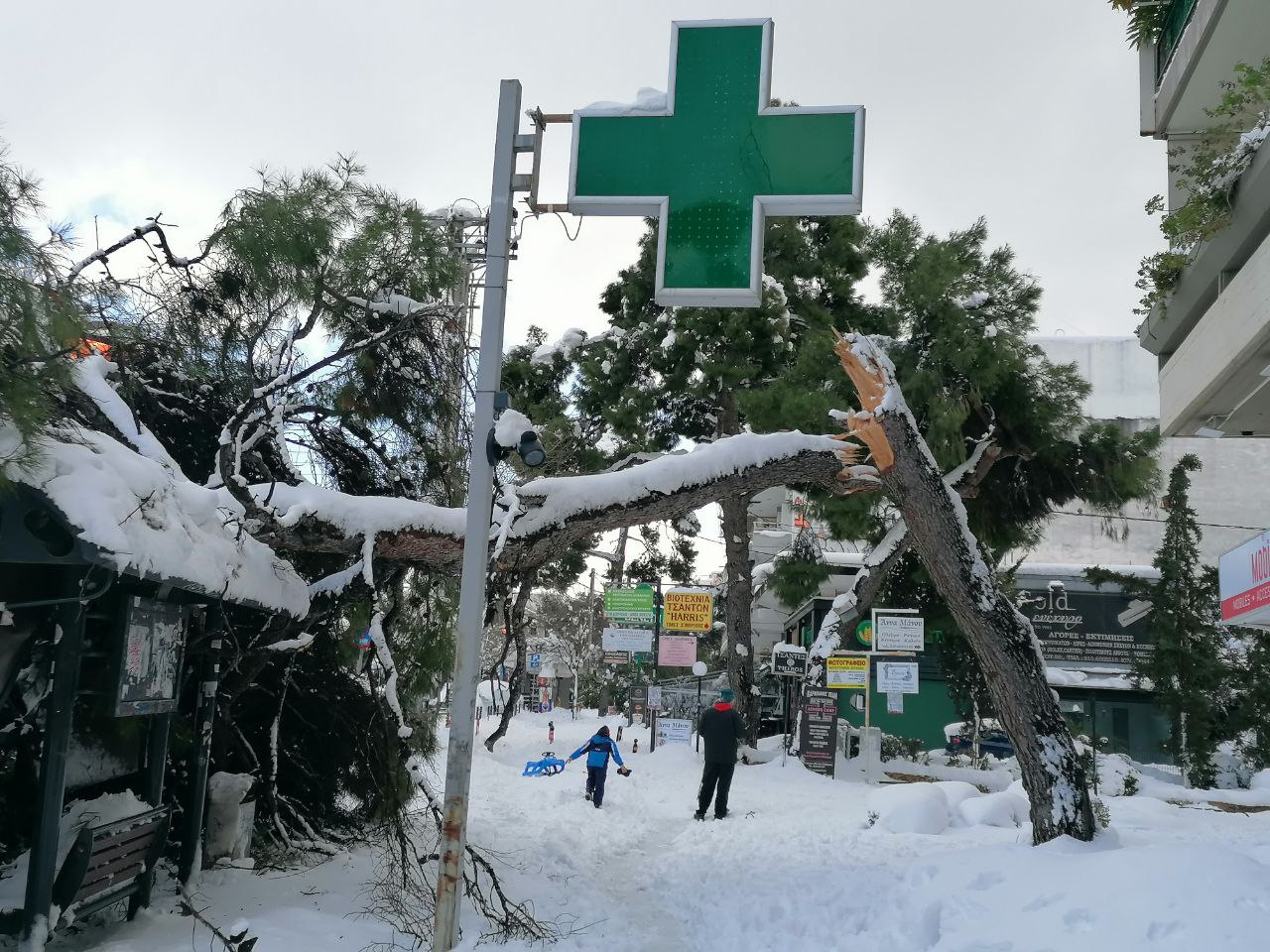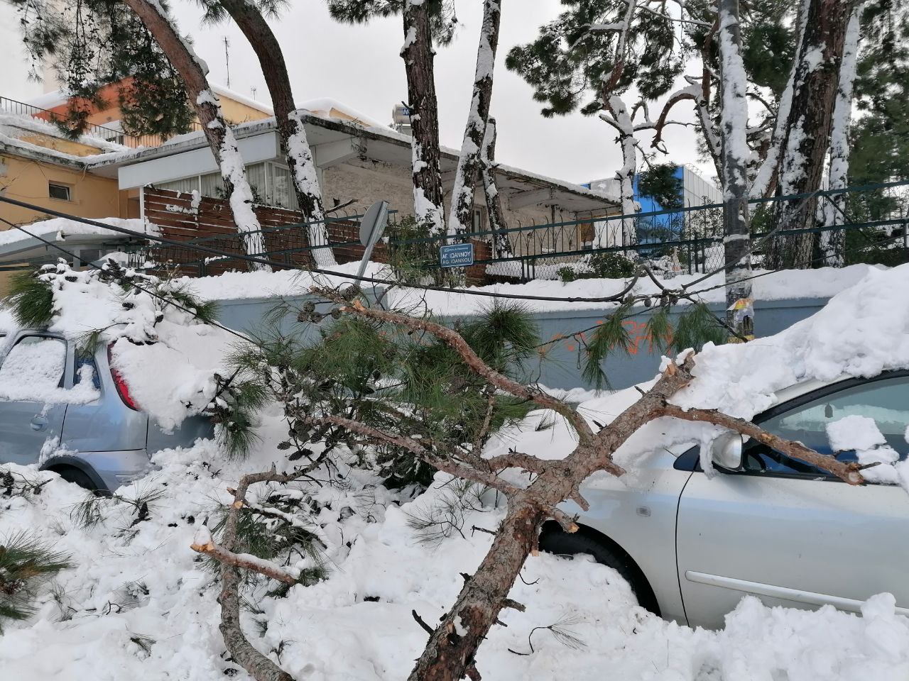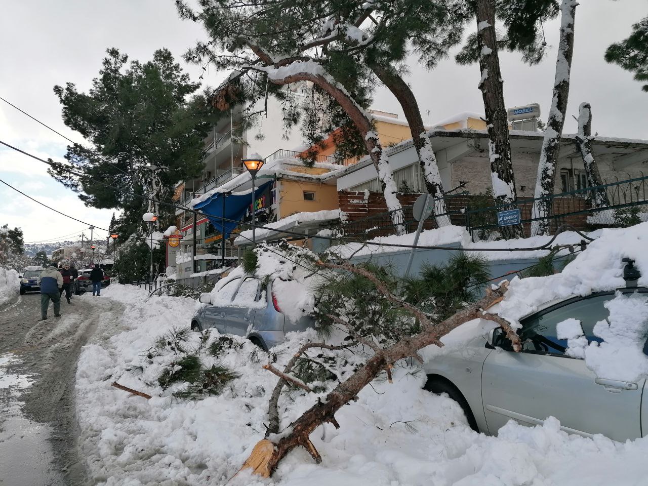 Δέντρα έχουν λυγίσει από το χιόνι στην Αγία Παρασκευή, στην πλατεία.