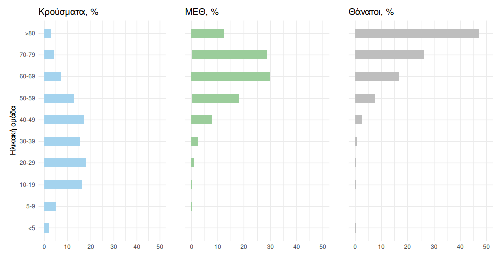 Η διάμεση ηλικία των κρουσμάτων είναι 35 έτη (εύρος 0.2 έως 106 έτη), ενώ η διάμεση ηλικία των θανόντων είναι 78 έτη (εύρος 0.2 έως 106 έτη).