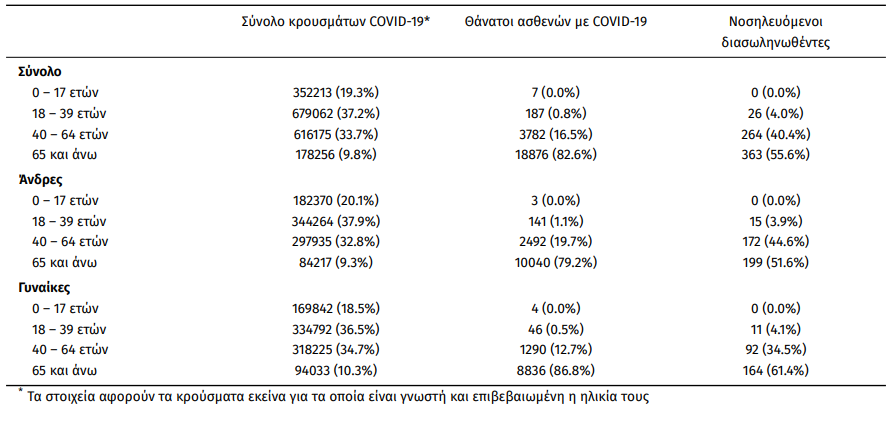 Οι νέοι θάνατοι ασθενών με COVID-19 είναι 98, ενώ από την έναρξη της επιδημίας έχουν καταγραφεί συνολικά 22.852 θάνατοι. Το 95.0% είχε υποκείμενο νόσημα ή/και ηλικία 70 ετών και άνω.