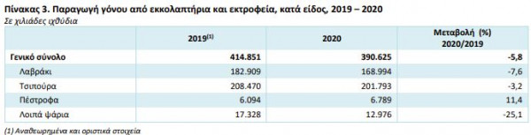 ▪ Λαβράκι: μείωση 7,6% το 2020 σε σχέση με το 2019. Συγκεκριμένα, ο γόνος για το λαβράκι ανήλθε σε 168.994 χιλιάδες ιχθύδια το 2020, έναντι 182.909 χιλιάδων ιχθυδίων το 2019.
