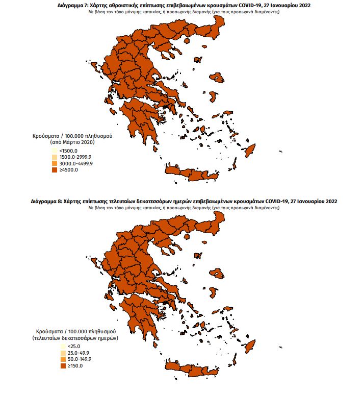 Γεωγραφική διασπορά: Ο χάρτης αποτυπώνει τη γεωγραφική κατανομή των συνολικών κρουσμάτων COVID-19 (από την αρχή της επιδημίας) ανά Περιφερειακή Ενότητα της χώρας, με βάση την δηλωθείσα διεύθυνση μόνιμης κατοικίας του ασθενούς, ή τη διεύθυνση προσωρινής διαμονής για τους τουρίστες και άλλους προσωρινά διαμένοντες στην Ελλάδα. Συμπεριλαμβάνονται τόσο κρούσματα με ιστορικό ταξιδίου (“εισαγόμενα”) όσο και κρούσματα με πιθανή εγχώρια μετάδοση.