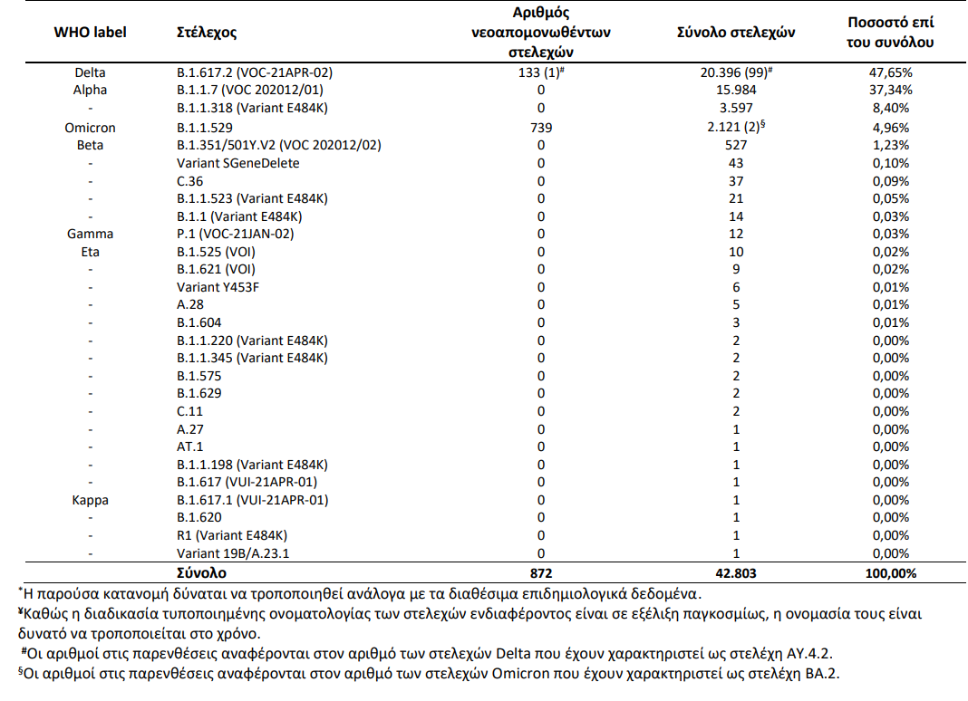 Εκ των 872 δειγμάτων με στελέχη ειδικού ενδιαφέροντος, τα 739 αφορούν στο στέλεχος Omicron και τα 133 αφορούν στο Delta.