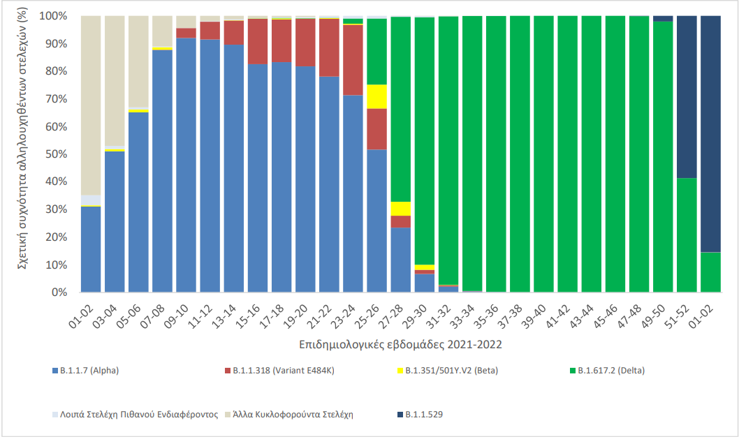 Μεταξύ των 225 δειγμάτων που έχουν ληφθεί ή επιλεγεί στοχευμένα κατά τη διάρκεια του διμήνου πριν τις 16 Ιανουαρίου 2022, 64% αφορούν στο στέλεχος Omicron και 36% στο στέλεχος Delta.