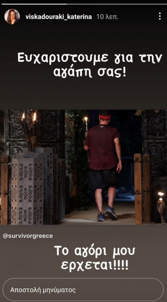 Λίγη ώρα μετά την αποχώρησή του, το δικό της μήνυμα θέλησε να στείλει στον ηθοποιό η σύζυγός του, Κατερίνα. «Ευχαριστούμε για την αγάπη σας. Το αγόρι μου έρχεται» έγραψε η Κατερίνα Βισκαδουράκη σε ανάρτησή της στα instastories.
