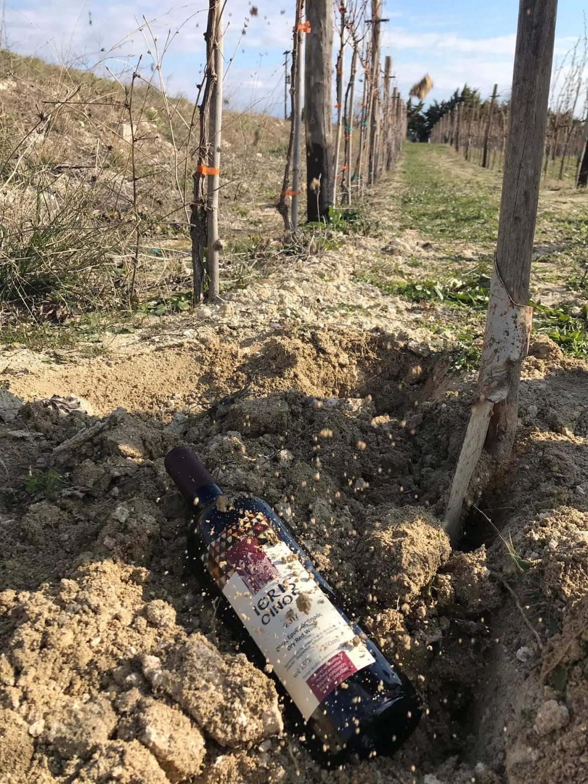 Ήδη, τα πρώτα μπουκάλια με κόκκινο κρασί, εσοδείας του 2017, φυτεύτηκαν διπλά στις ρίζες, αφού τοποθετήθηκαν μέσα σε ειδικές κατασκευές κι ενώ έγιναν νωρίτερα όλες οι προεργασίες και οι μετρήσεις. Στην «αγκαλιά» της γης και θα μείνουν τουλάχιστον δώδεκα μήνες.