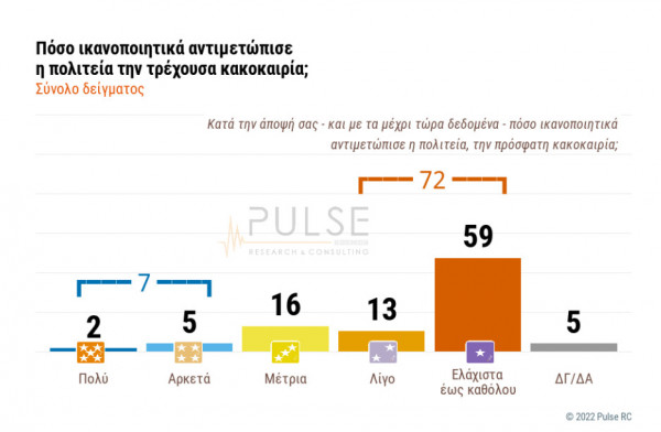 Συγκεκριμένα, σε ποσοστό 72% δηλώνουν ελάχιστα έως καθόλου (59%) και λίγο (13%) ικανοποιημένοι, ενώ το 16% απαντά μέτρια και το 7% αρκετά (5%) και πολύ (2%).