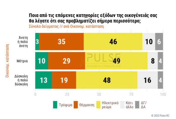 Εντυπωσιακό είναι, μάλιστα, ότι ακόμη και όσοι δηλώνουν ότι έχουν «άνετη ή πολύ άνετη» οικονομική κατάσταση θεωρούν ως το πιο σημαντικό έξοδο την πληρωμή των λογαριασμών ηλεκτρικού ρεύματος σε ποσοστό 46%, ενώ το ίδιο απαντούν και όσοι έχουν μέτρια οικονομική κατάσταση με 49% ή δύσκολη και πολύ δύσκολη οικονομική κατάσταση με 48%.