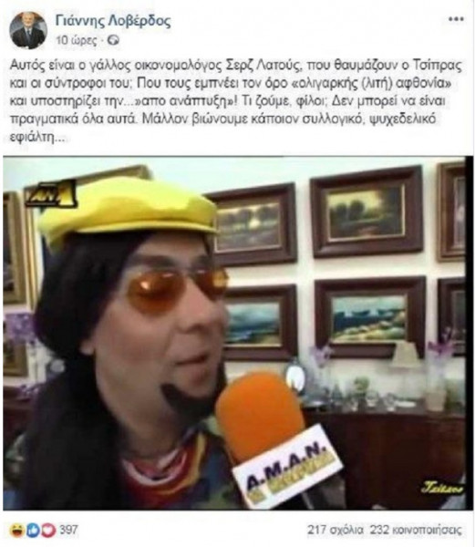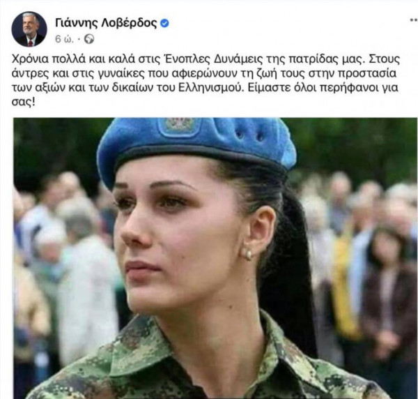 Ο βουλευτής της Νέας Δημοκρατίας Γιάννης Λοβέρδος έχει υποπέσει σε ουκ ολίγες γκάφες στις αναρτήσεις του στo Facebook. Από την ημέρα εορτασμού των Ελληνικών ενόπλων δυνάμεων που ανέβασε τη φωτογραφία γυναίκας αξιωματικού του… Σερβικού στρατού. Μέχρι τον οικονομολόγο Σερζ Λατούς που στην φωτογραφία της ανάρτησης του είχε βάλει τον Σωτήρη Καλυβάτση ο οποίος υποδυόταν τον Μαέβιους Παχατουρίδη.
