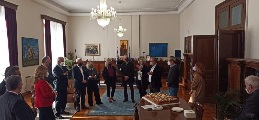 Ο Υπουργός Εσωτερικών, κ. Μάκης Βορίδης, έκοψε, σήμερα, την Βασιλόπιτα του Τομέα Μακεδονίας και Θράκης του Υπουργείου Εσωτερικών, στο Διοικητήριο της Θεσσαλονίκης. Μαζί με τον Υφυπουργό Εσωτερικών, αρμόδιο για θέματα Μακεδονίας και Θράκης κ. Σταύρο Καλαφάτη μοίρασαν τα κομμάτια στους επικεφαλής των Διευθύνσεων και των λοιπών Υπηρεσιών. Παρούσα στην κοπή της Βασιλόπιτας ήταν και η Διευθύντρια του Πρωθυπουργικού Γραφείου στη Θεσσαλονίκη, κ. Μαρία Αντωνίου. Ο κ. Βορίδης είχε την ευκαιρία να γνωρίσει τον κάθε Διευθυντή και Προϊστάμενο του Τομέα ξεχωριστά και να ενημερωθεί για την πορεία του έργου τους. Το φλουρί βρέθηκε στο… τελευταίο κομμάτι της Βασιλόπιτας, το οποίο ήταν για το Αυτοτελές Τμήμα Περιφερειακού Τύπου και Εθιμοτυπίας. “Last but not least”, σχολίασε ο Υφυπουργός Εσωτερικών.