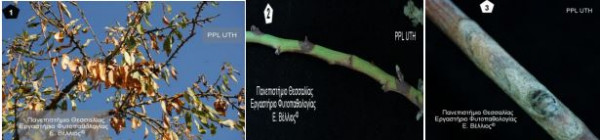 Συμπτώματα: Τα προσβεβλημένα άνθη και οι βλαστοί μοιάζουν σαν ζεματισμένοι ή καμένοι. Ο μύκητας εξαπλώνεται και στο φλοιό των παλαιοτέρων κλάδων, όπου σχηματίζει έλκη στα οποία εμφανίζεται έκκριση κόμεος.
