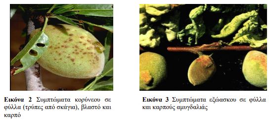 Συμπτώματα: Το κορύνεο προκαλεί νεκρωτικές κηλίδες στα φύλλα και στους καρπούς, μικρά έλκη στους βλαστούς και κλάδους. Ο Εξώασκος προσβάλει τα ακραία νεαρά φύλλα την άνοιξη τα οποία παραμορφώνει.