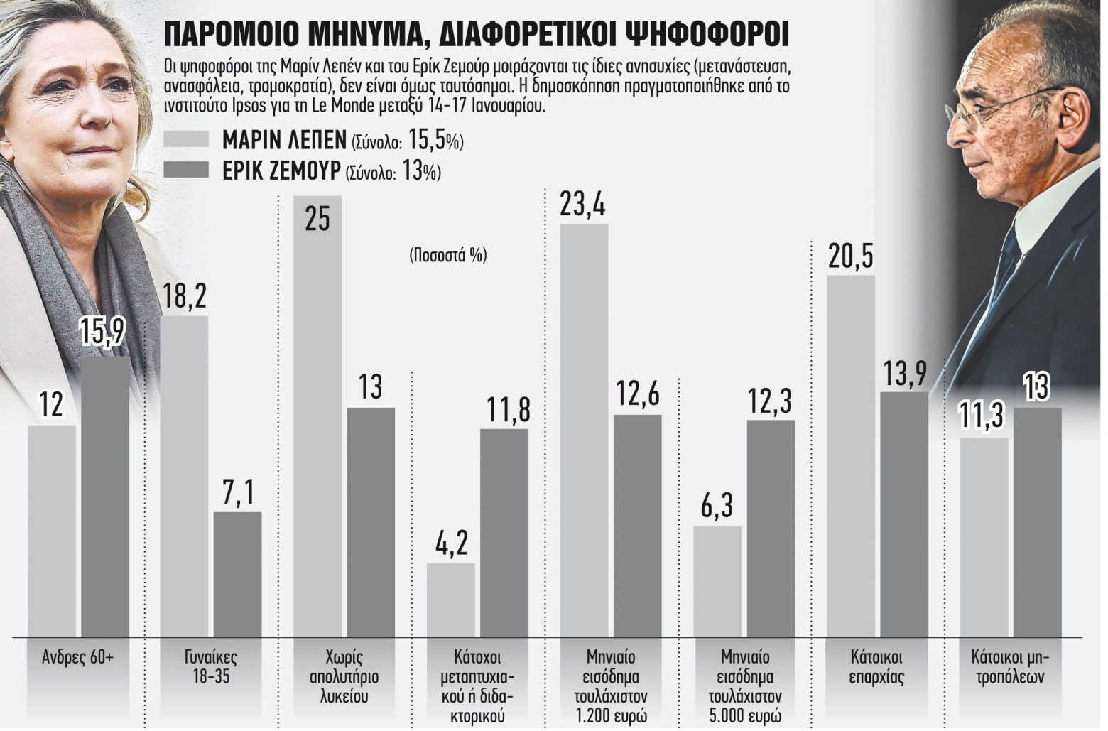 Οτι θα βγαίνανε μαχαίρια ανάμεσα στη Μαρίν Λεπέν, την de facto ηγέτιδα της Εθνικής Συσπείρωσης (RN), και τον τρις καταδικασμένο για υποκίνηση φυλετικού μίσους Ερίκ Ζεμούρ, ήταν δεδομένο από τη στιγμή που ο αλλοτινός τηλεκήρυκας και αρθρογράφος αποφάσισε να δηλώσει υποψήφιος για τις γαλλικές προεδρικές εκλογές: στην ίδια, ή περίπου την ίδια, ακροδεξιά δεξαμενή αγρεύουν ψήφους και η άνοδος που κατέγραψε (προτού σταθεροποιηθεί στην τέταρτη θέση, πίσω από τον γάλλο πρόεδρο Εμανουέλ Μακρόν, τη Μαρίν Λεπέν και την υποψήφια της Δεξιάς, Βαλερί Πεκρές) ο Ζεμούρ απειλεί να αφήσει τη Λεπέν εκτός δεύτερου προεδρικού γύρου.