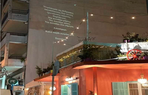Σε μήνυμα που προβλήθηκε μέσω προτζέκτορα από την ταράτσα του καταστήματος στον τοίχο διπλανής πολυκατοικίας, οι ιδιοκτήτες και οι εργαζόμενοι της ταβέρνας έγραψαν χθες Πέμπτη με αφορμή την δολοφονία του Άλκη τα εξής: