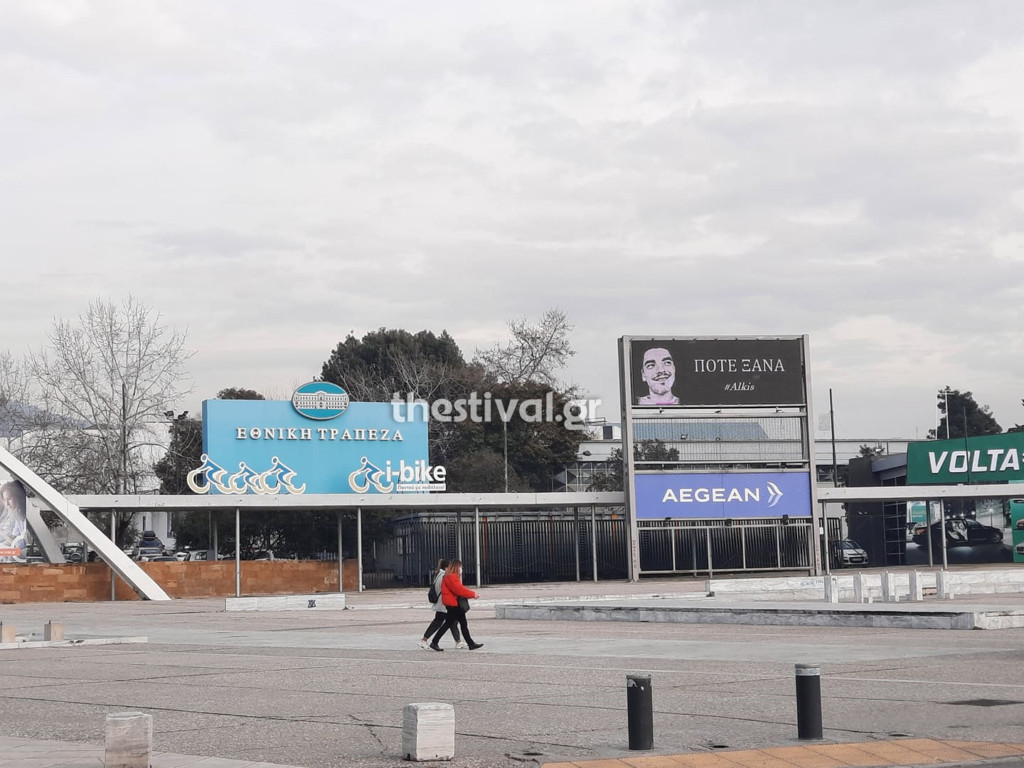 Η φωτογραφία του Άλκη Καμπανού μαζί με το μήνυμα «ποτέ ξανά» σε φωτεινή πινακίδα στη νότια πύλη της ΔΕΘ μαγνητίζει τα βλέμματα των περαστικών, προκαλώντας συγκίνηση και θλίψη για τον 19χρονο που δολοφονήθηκε άγρια από ενέδρα οπαδών.