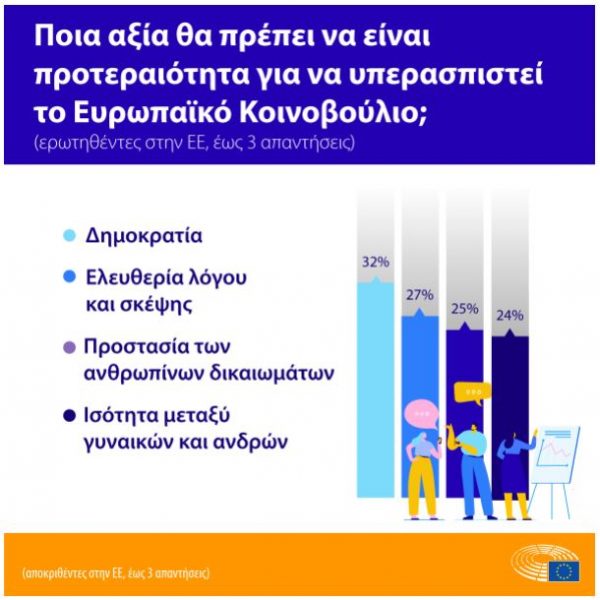 Οι πολίτες της ΕΕ επιθυμούν το Κοινοβούλιο να υπερασπιστεί τη δημοκρατία: το ένα τρίτο των ερωτηθέντων (32%) θεωρεί ότι αυτή είναι η πιο σημαντική αξία προς υπεράσπιση. Το κράτος δικαίου προτάσσουν οι Έλληνες πολίτες κατά 39%.