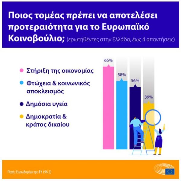 Η υποστήριξη της οικονομίας και δημιουργία νέων θέσεων εργασίας (65%), η καταπολέμηση της φτώχειας και του κοινωνικού αποκλεισμού (58%), η δημόσια υγεία (56%) αποτελούν για τους Έλληνες κορυφαίες πολιτικές προτεραιότητες. Αντίστοιχα, για τους Ευρωπαίους προτάσσονται η δημόσια υγεία (42%), η φτώχεια και ο κοινωνικός αποκλεισμός (40%), καθώς και η κλιματική αλλαγή (39%) .