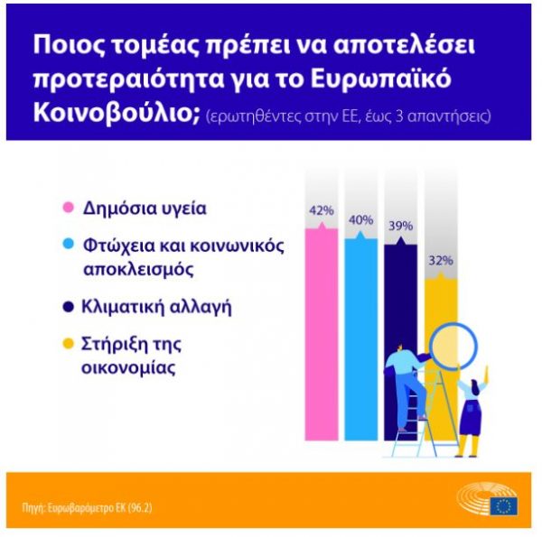 Συνολικά, οι Ευρωπαίοι πολίτες συνεχίζουν να θεωρούν τη δημόσια υγεία ως κορυφαία πολιτική προτεραιότητα για το Κοινοβούλιο σε ποσοστό 42%, ακολουθούμενη με μικρή διαφορά από την καταπολέμηση της φτώχειας και του κοινωνικού αποκλεισμού (40%) και τη δράση κατά της κλιματικής αλλαγής (39%), ενώ οι νέοι θέτουν πρώτη στη λίστα τους την καταπολέμηση της κλιματικής αλλαγής.