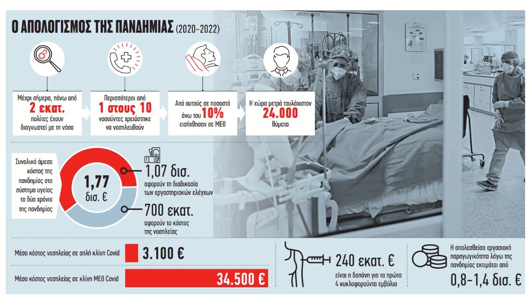 Ο ακριβός λογαριασμός της επέλασης του κορωνοϊού για τη δημόσια υγεία – Οι δαπάνες για νοσηλεία εντός ή εκτός ΜΕΘ και για τη διενέργεια ελέγχων – Σημαντικές οι οικονομικές επιπτώσεις και από τις χαμένες εργατοώρες – Το κέρδος από την εμβολιαστική εκστρατεία