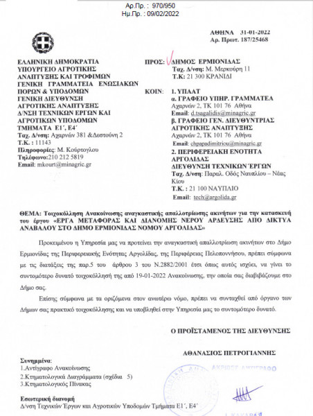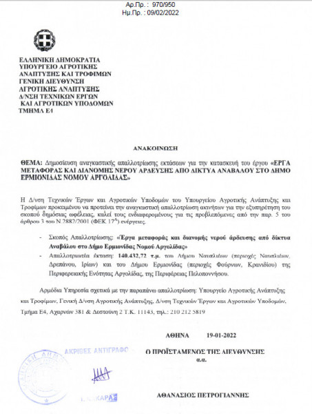 Οι κτηματολογικοί πίνακες και οι σχετικοί χάρτες με τις αναγκαστικές απαλλοτριώσεις και την διαδρομή του κεντρικού αγωγού αποστάλθηκαν στον Δήμο Ερμιονίδας από την Διεύθυνση Τεχνικών Έργων και Υποδομών του Υπουργείου Αγροτικής Ανάπτυξης και Τροφίμων, με σκοπό να τοιχοκολληθεί η προβλεπόμενη ανακοίνωση και να ενημερωθούν οι ιδιοκτήτες, προκειμένου να ολοκληρωθούν άμεσα οι απαλλοτριώσεις και τους επόμενους μήνες να προχωρήσει η δημοπράτηση του έργου.