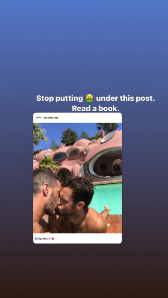 «Είμαι γκέι. Σταματήστε να σχολιάζετε κάτω από το post μου. Η αγάπη πάντα νικάει! Χαίρομαι κατά κάποιον τρόπο που κάνουμε αυτή την επίπονη συζήτηση. Μεγάλωσα χωρίς να έχω το πρότυπο ενός γκέι ζευγαριού και ξέρω πόσο σημαντικό είναι να είμαστε αυτό το παράδειγμα για τα νέα παιδιά εκεί έξω. Θα πολεμήσουμε για εκείνους εκεί έξω, για να αποδείξουμε πως η αγάπη πάντα κερδίζει. Θα συνεχίσω να ανεβάζω φωτογραφίες αγάπης. Πάντα. Είστε όμορφοι, μην το ξεχνάτε ποτέ» έγραψε ο Jacquemus.