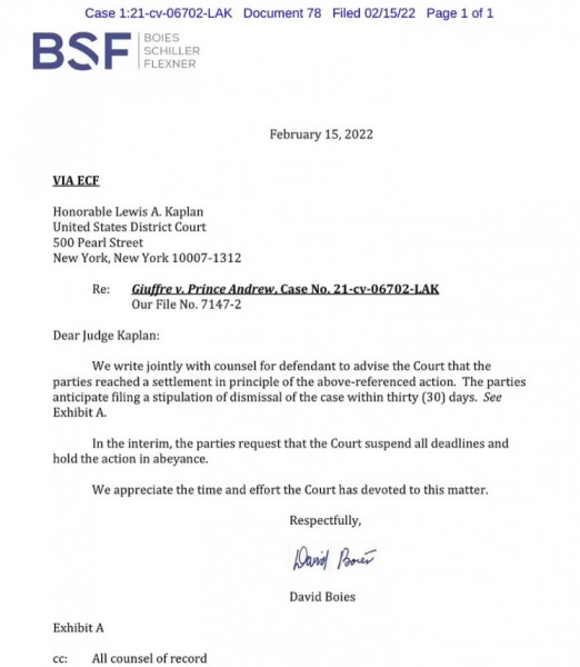 Ο διακανονισμός έρχεται λίγες εβδομάδες πριν ο πρίγκιπας Άντριου κληθεί να συμμετάσχει σε ένορκη κατάθεση, κατά την οποία θα δεχόταν ερωτήσεις από τους δικηγόρους της Τζιούφρε για τις κατηγορίες της. Η κοινή δήλωση του πρίγκιπα Άντριου και της Τζιούφρε φέρεται να αναφέρει ότι ο πρίγκιπας Άντριου δεν παραδέχεται καμία από τις κατηγορίες εναντίον του.