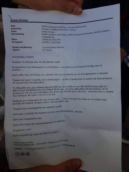 Η οδηγία για εκδίωξη αστέγων από την υπεύθυνη ανθρώπινου δυναμικού της γνωστής αλυσίδας ΙΑΝΟΣ εστάλη προς το κατάστημα της οδού Σταδίου, επειδή οι άστεγοι που βρίσκουν καταφύγιο εκεί τις νύχτες τους χαλάνε τη βιτρίνα.