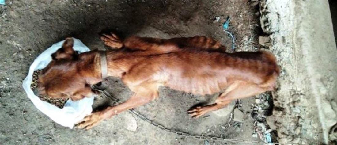 Το άτυχο πλάσμα βρισκόταν αλυσοδεμένο και όπως φαίνεται και στις φωτογραφίες, πλήρως υποσιτισμένο και ταλαιπωρημένο.