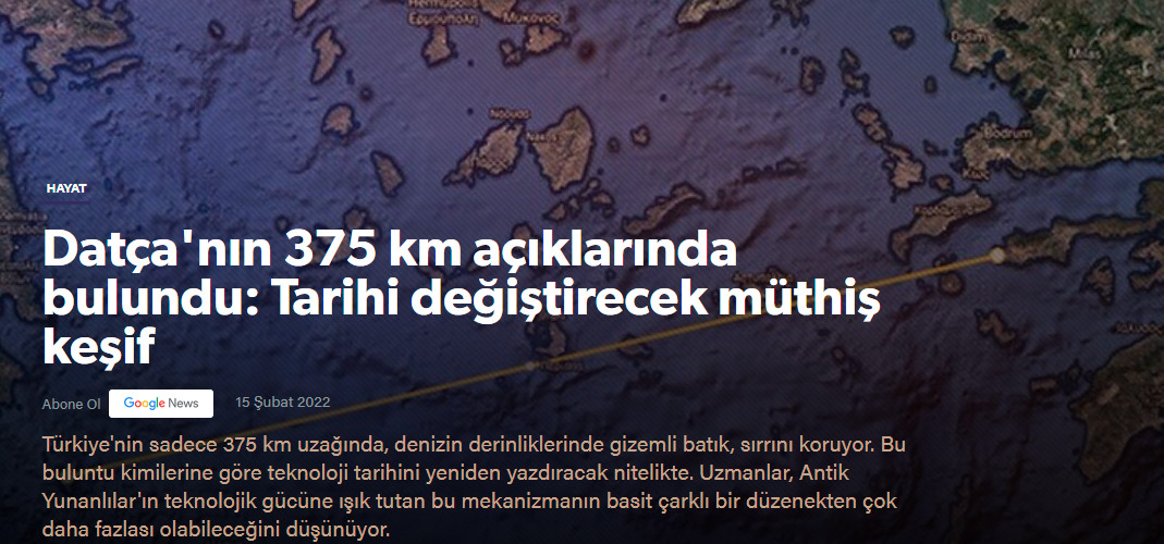 Η τουρκική εφημερίδα περιγράφει την ιστορία του μηχανισμού των Αντικυθήρων, τη σχέση του με τους Αρχαίους Ελληνες, τις επιστημονικές ερμηνείες γι’ αυτόν τον μηχανισμό, αλλά προσδιορίζει γεωγραφικά την περιοχή με χάρτη που δείχνει την απόστασή της από την Τουρκία (στην κεντρική φωτογραφία του άρθρου, αλλά και στο τέλος του με τη λεζάντα: Βρέθηκε 375 χλμ μακριά από την Datça – Ντάτσα, παραθαλάσσια πόλη και χερσόνησος στη νοτιοδυτική Τουρκία).