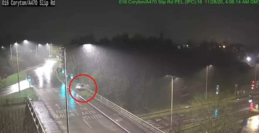 Το περιστατικό συνέβη στη Βρετανία και το κατέγραψαν κάμερες ασφαλείας. Το αυτοκίνητο έτρεχε με ιλιγγιώδη ταχύτητα πάνω από τον αυτοκινητόδρομο Α470, έπεσε επάνω στα κιγκλιδώματα της γέφυρας και προσγειώθηκε άτσαλα στον αυτοκινητόδρομο.