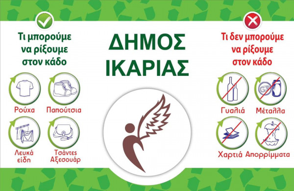 Μετά από πρωτοβουλία και προσπάθεια του ίδιου του Δημάρχου Ικαρίας Νικόλαο Καλαμπόγια με γνώμονα πάντα τη μείωση των σύμμεικτων απορριμμάτων του Δήμου, ο Δήμος Ικαρίας προχώρησε στην τοποθέτηση κόκκινου κάδου ανακύκλωσης ρούχων, υποδημάτων, αξεσουάρ και λευκών ειδών σε συνεργασία με την ιδιωτική εταιρία στοχεύοντας στην επαναχρησιμοποίηση/ανακύκλωση των ρούχων και των υλικών τους.