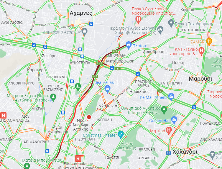 Όπως φαίνεται και στον παρακάτω χάρτη ο δρόμος είναι «κόκκινος» λόγω της συμφόρησης που δημιούργησε το τροχαίο ατύχημα, με την ουρά των αυτοκινήτων να φτάνει σχεδόν τα τρία χιλιόμετρα.