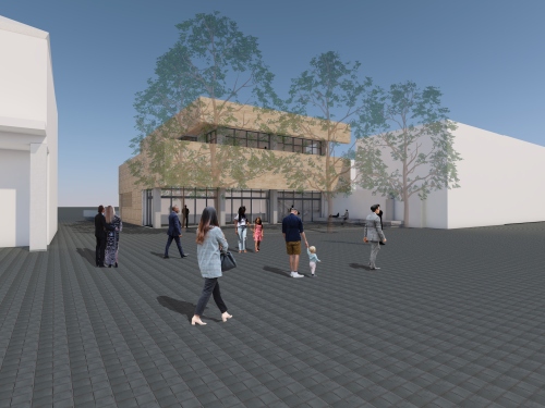 Έμπροσθεν της στοάς στη Ν.Α όψη του κτιρίου, ο ακάλυπτος χώρος διαμορφώνεται σε ευρύχωρη πλατεία σε επαφή με τον κεντρικό δρόμο του αστικού ιστού για να μπορεί να φιλοξενήσει εκδηλώσεις και συναντήσεις σε ανοιχτό χώρο.