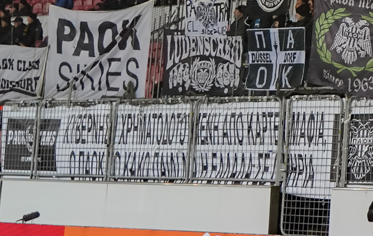 «Κυβέρνηση χρηματοδοτούμενη από καρτέλ-μαφία, ο ΠΑΟΚ το κακό παιδί μα η Ελλάδα σε ομηρία», ανέφερε χαρακτηριστικά το πανό που ανάρτησαν. Ένα πανό που αρχικά το έκαναν… βόλτα στην πόλη και εν συνεχεία το κρέμασαν καις το γήπεδο της Μίντιλαντ, για να μπορεί να είναι ευδιάκριτο και από τους τηλεοπτικούς δέκτες.