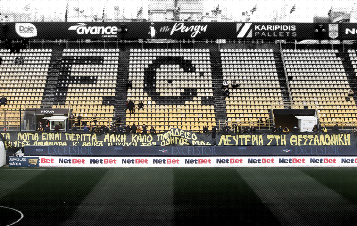 Το Κλεάνθης Βικελίδης έγινε τόπος διαμαρτυρίας από τους οπαδούς του Αρη. Με τα λόγια, τις σκέψεις να αποτυπώνονται στα πανιά. Τα οποία πήραν θέση στις εξέδρες του γηπέδου: Το πρώτο, αφιερωμένο στη μνήμη του Αλκη: «Τα λόγια είναι περιττά… Άλκη καλό παράδεισο. Εφυγες άνανδρα και άδικα. Η ψυχή σου οδηγός μας. ΛΕΥΤΕΡΙΑ ΣΤΗ ΘΕΣΣΑΛΟΝΙΚΗ».
