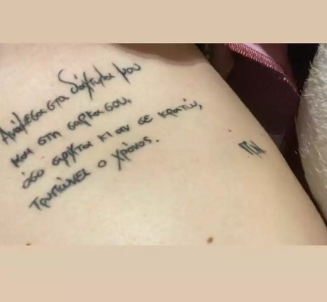«Ανάμεσα στα δάχτυλά μου και στη σάρκα σου, όσο σφιχτά κι αν σε κρατώ, τρυπώνει ο χρόνος. Π.Ν», γράφει το τατουάζ της συντρόφου του Πάνου Νάτση.